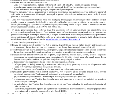 - Przesyłając pracę na konkurs, uczestnik (w przypadku uczestników niepełnoletnich – poprzez jego opiekuna prawnego) wyraża tym samym zgodę na przetwarzanie danych osobowych (w tym swojego wizerunku) do celów organizacji i przeprowadzenia konkursu, posiadając jednocześnie prawo wglądu do nich i ich poprawiania.