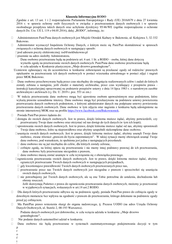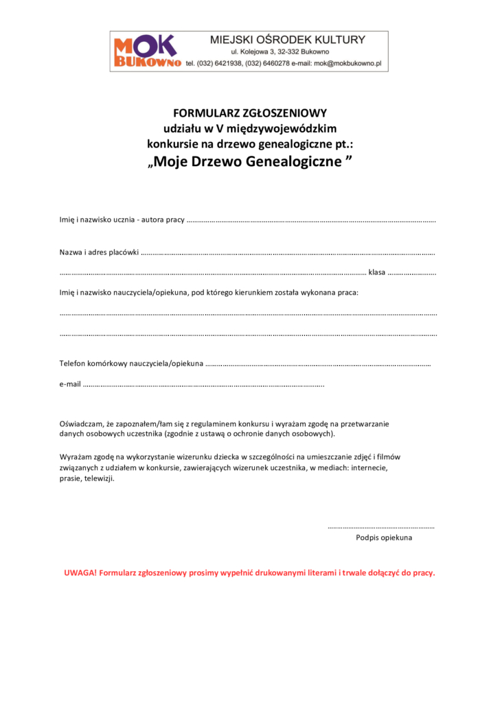 - Wszelkie dodatkowe informacje można uzyskać u koordynatora konkursu pod adresem mailowym: mok@mokbukowno.pl lub pod numerem telefonu: 32 6421938.