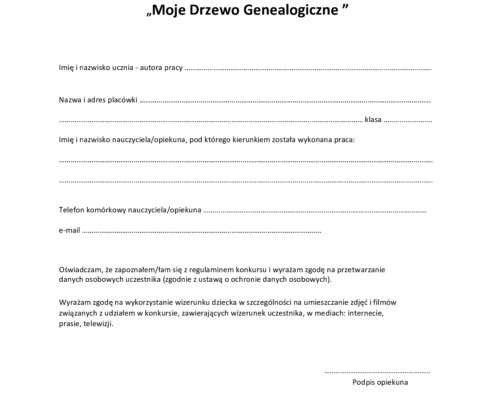 poprzez jego opiekuna prawnego) oświadcza, iż przysługują mu prawa autorskie do nadesłanej pracy oraz, że wyraża zgodę na nieodpłatne jej wykorzystanie przez organizatora do celów związanych z konkursem i celach statutowych.